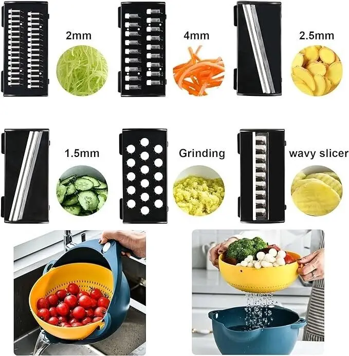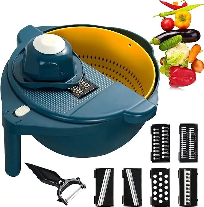 9 in 1 Vegetable Chopper with Drain Basket, Multifunction Rotate Vegetable Cutter, Mandoline for Onion, Carrot, Garlic, Potato, Fruit Salad Making#